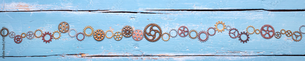 Viele Zahnräder auf Holz, Konzept Verbindung und Teamwork, Panorama