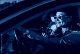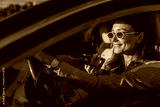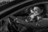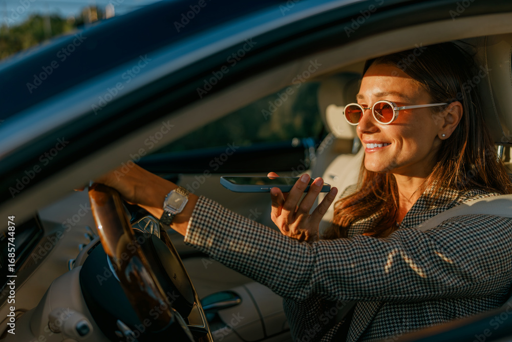 A fashionable woman enjoys driving her stylish car and sipping a beverage, showcasing luxury and sophistication