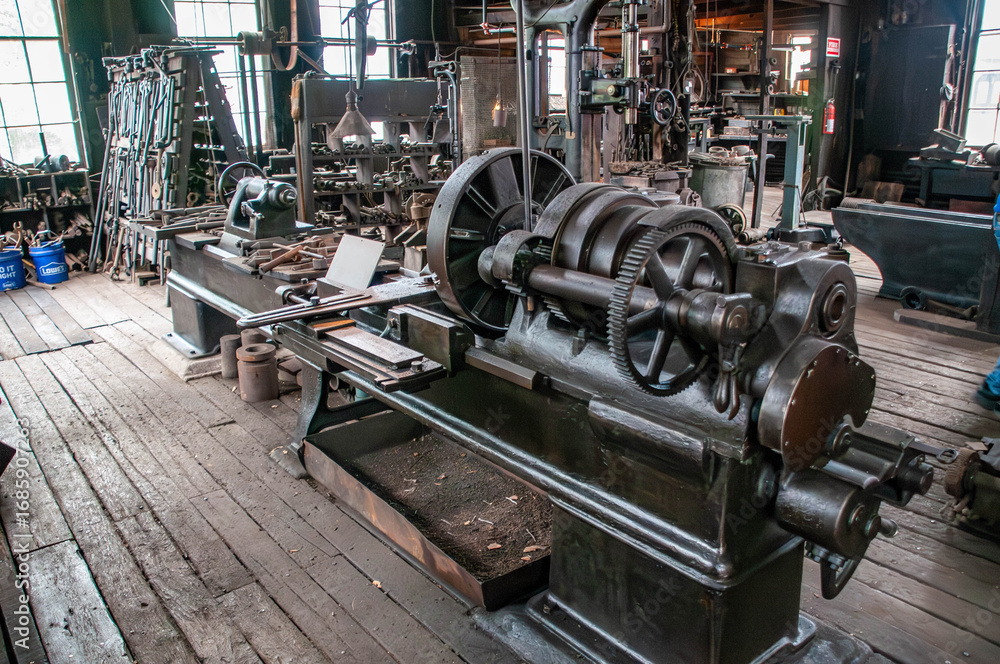 A vintage workshop filled with various tools and machinery showcases an industrial lathe in working condition.