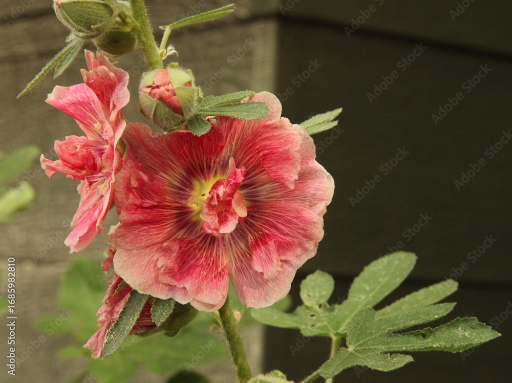 Holloyhock (Alcea) pink garden flower with extra petals in Montana