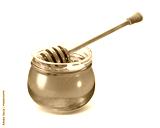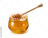 Honey jar with wooden dipper isolated on white