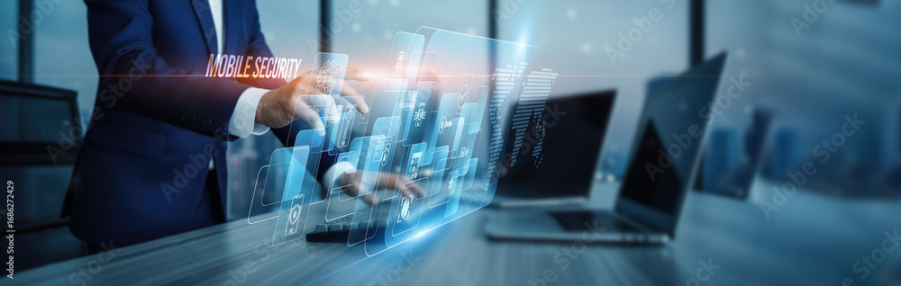 Mobile security concept. Hand touching advanced mobile device security systems, protection connection on virtual screen encryption malware detection authentication privacy monitoring threat mitigation
