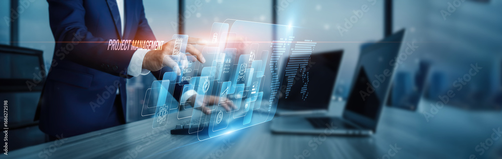 Project management concept. Hand touching digital project management platforms, workflow connection on virtual screen scheduling task tracking collaboration timelines automation resource allocation.