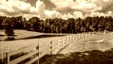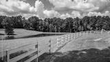 A large tree shades the front area of a white fence. There is a pasture, pond and trees in the background. Clouds and blue sky are in the background.