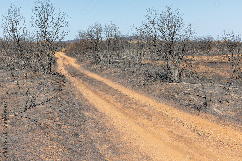 Burned oak trees and a rural road. Forest fire in Molezuelas de la Carballeda, Zamora and León, Spain, 2025.