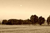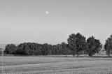 Evening summer landscape. Trees on the fields and the moon in the sky.