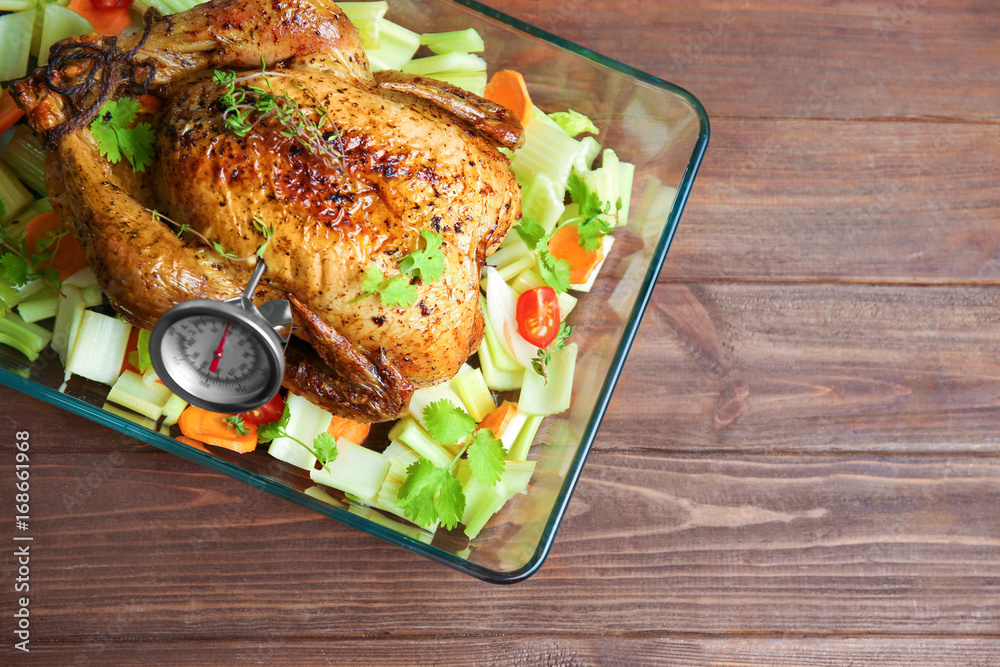 Golden roasted turkey with meat thermometer on wooden background