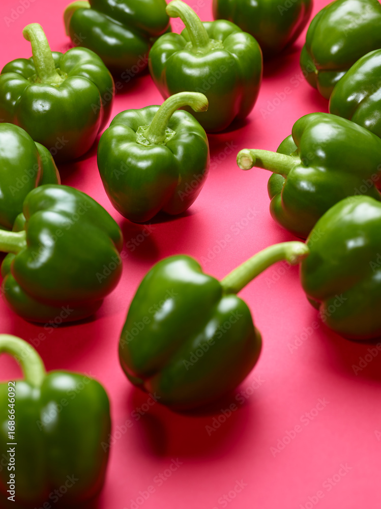 Beautiful sweet green bell peppers over red background