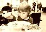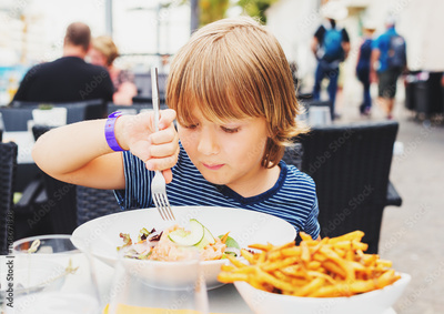 Little boy having lunch in the restaurant, child eating fresh salmon salad and french fries