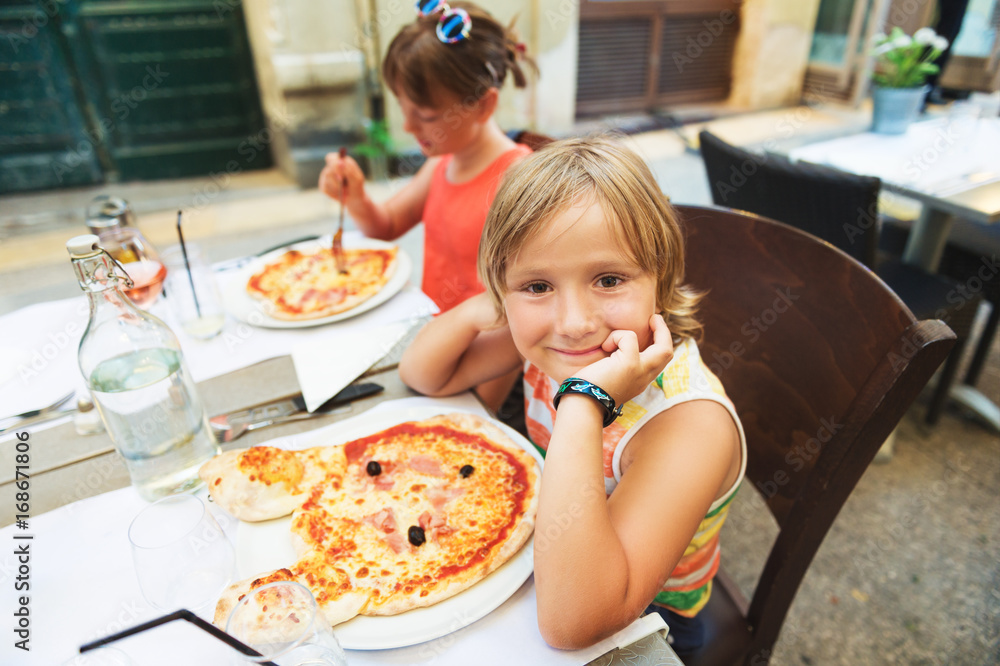 Happy little boy eating kid's pizza in the restaurant. Menu for children, animal shaped italian pizza for youngsters