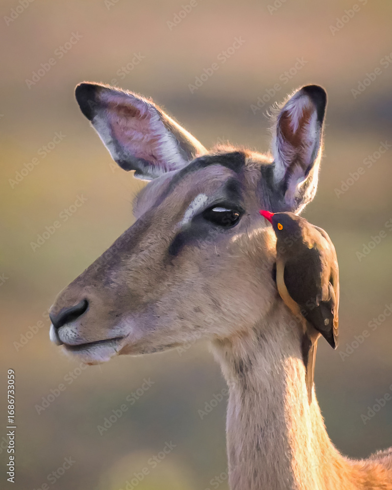 Close-up face of an impala with a bird that they live with symbiotic relationship. Bird will eat ticks or fleas that cling to impala. Taken picture at South Africa. Cleaning animals.