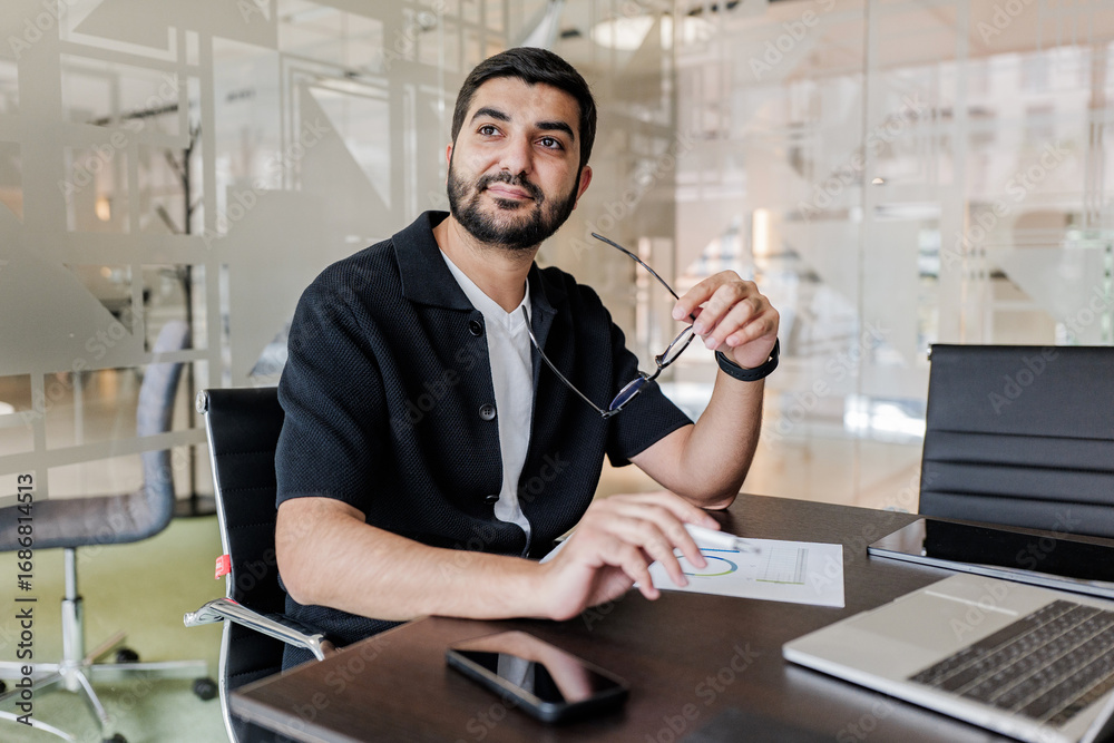 Confident professional engaged in thoughtful brainstorming while seated at a modern workspace