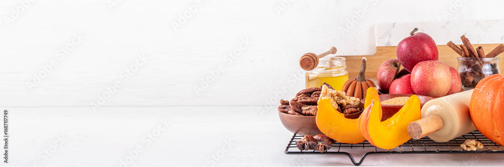 Fall baking, cooking seasonal dessert background with various ingredients - honey, pumpkin squash, brown sugar, cinnamon, spices, red apples, walnuts, pecans. Autumn, thanksgiving bakery background