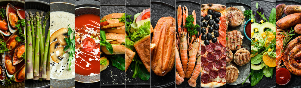 Background of food, drinks and dishes of European cuisine. on a dark stone background. Photo collage, banner from photos.