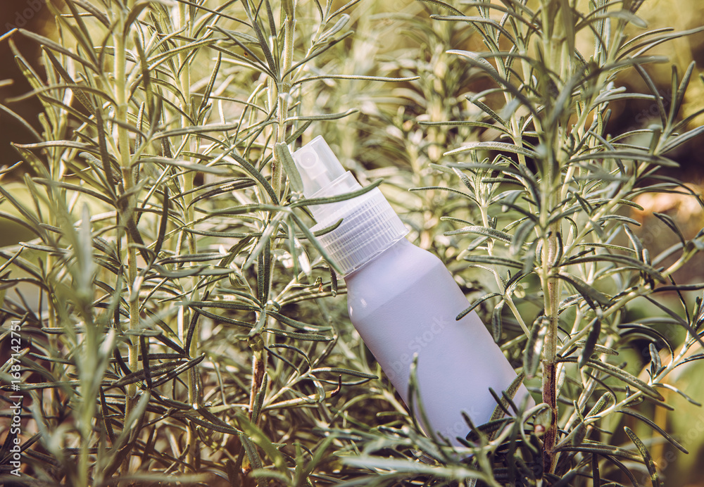 Homemade rosemary water made from rosemary sprigs, for hair and skin care. A purple spray bottle nestled among rosemary bushes.