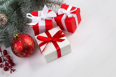 Three boxes with a gift tied with satin ribbons, a fir branch and Christmas tree decorations on a white background