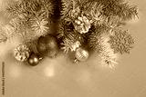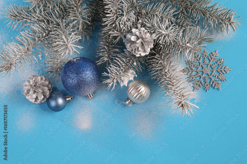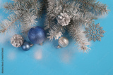 Christmas card with fir branches and Christmas decorations on a light blue background