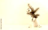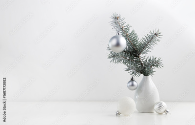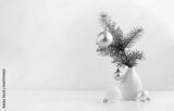 Fir branch and Christmas decorations in a vase on a white table