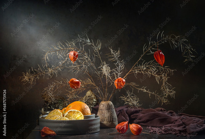 Contemporary still life with dry branches, physalis and oranges on a dark background