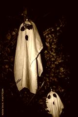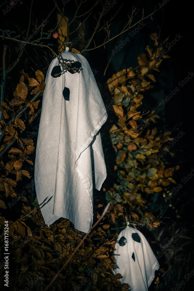 Cute Halloween ghost crafts simply made with white cloth and balloons hanging from a tree. Festivity Halloween decorations. Children crafts for party. Funny DIY for 31th October scary celebration.