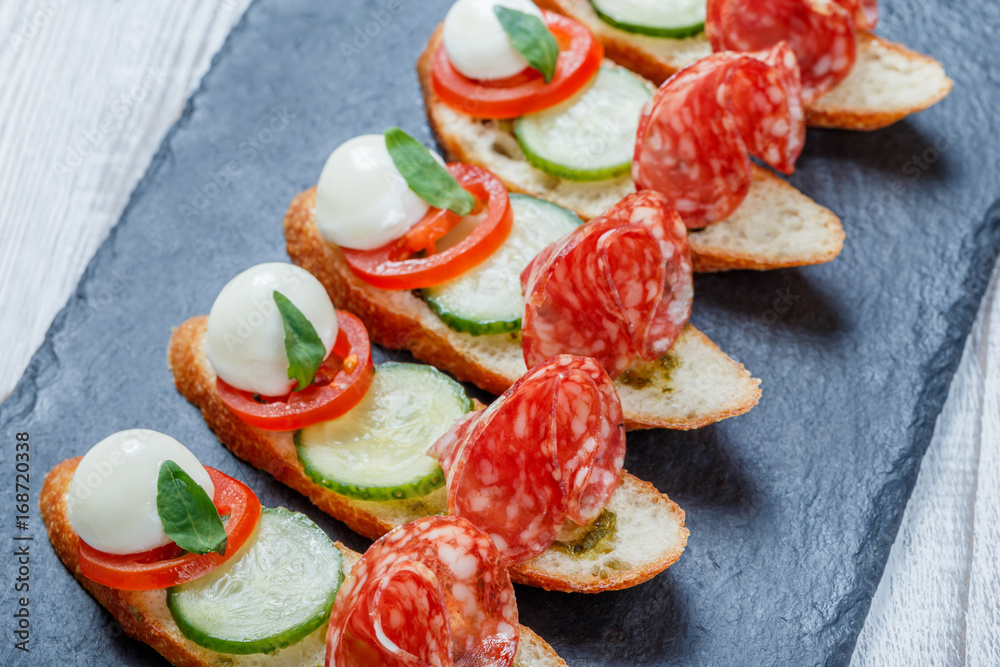 Caprese sandwiches with tomato, mozzarella cheese, basil, salami on ciabatta bread on stone slate background close up. Delicious appetizer snacks, bruschetta, crostini, antipasti. Top view