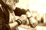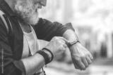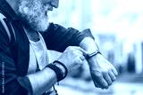 Cheerful old man touching screen of his watch