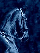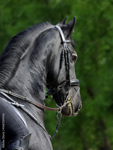 Black friesian dressage horse on dark green background