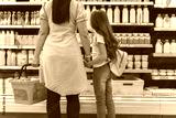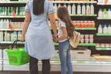 Mom and little daughter choosing dairy product