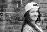 Young stylish woman in jeans clothes and a cap posing near a brick wall