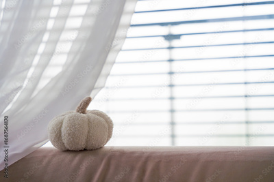 Cozy white fabric pumpkin rests on pastel sofa beside flowing curtain, with blurred window blinds behind, creating a soft minimal autumn home decor scene with gentle natural light.
