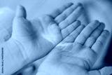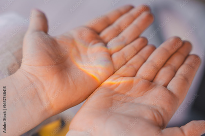 Close-up of childs open hands with soft rainbow light shining across the palms, creating a dreamy and emotional atmosphere with warm tones and shallow depth of field.