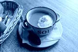 Closeup of creamy pumpkin soup with whipped cream in an enamel mug with chipped rim, placed on wooden table with yellow napkin and basket in cozy countryside-style cafe interior