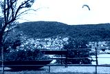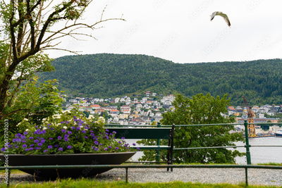 Scenic summer view from a public park overlooking the fjord with a flying gull, flowering plants, green bench, and hillside residential buildings in the background in Bergen, Norway