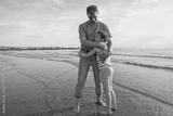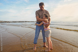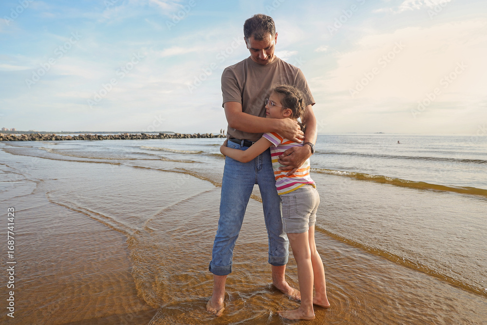 Dad tenderly hugs his happy 8 year old daughter on beach near sea
