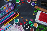 Colorful school supplies, designed on black surface with Turkish Money and copy space
