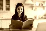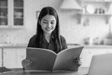 Homeschooling Education. Preteen Arab Girl Reading Text Book Doing School Homework At Home Interior. Middle Eastern Kid Schooler Studying Near Laptop While Sitting At Desk Indoor