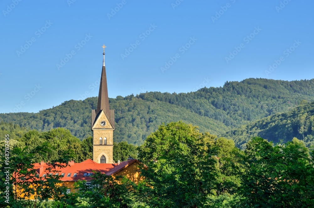 Mountain summer landscape. Church tower in the countryside on a background of beautiful green hills.