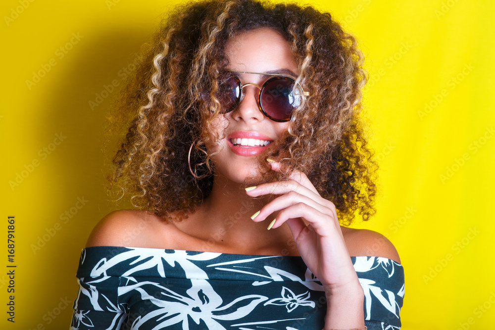 portrait indoors of a young afro american woman in sunglasses. Yellow background. Lifestyle. Casual clothing