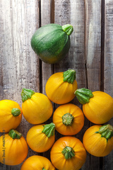 Yellow zucchini overhead group on old rustic white wooden table in studio