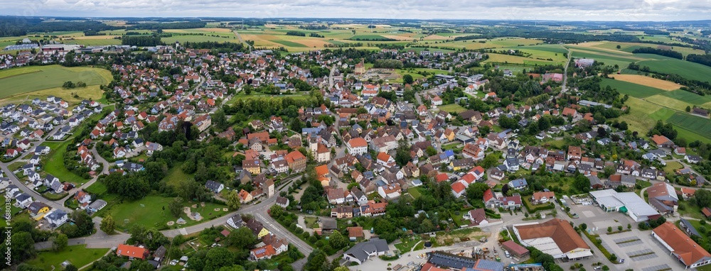 An aerial panorama view above the old town of the city Gerabronn on a cloudy summer day in Bavaria, Germany