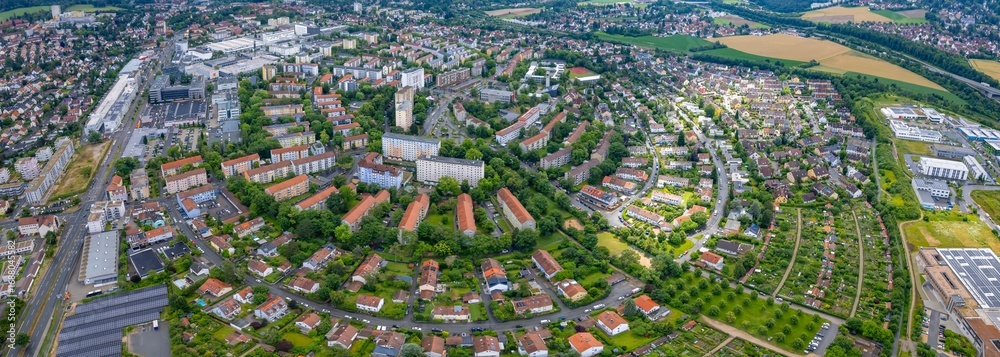 A panoramic aerial view of the downtown around the city Hardhöhe Fürth in Bavaria , Germany on a sunny day in spring