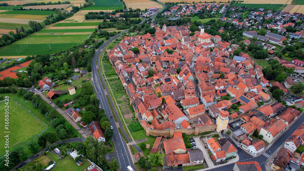 Aerial panorama view of the old town in the city Mainbernheim in Bavaria in Germany on a cloudy day in spring