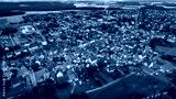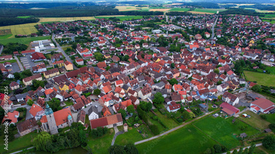 An aerial panorama view above the old town of the city Markt Erlbach on a cloudy summer day in Bavaria, Germany