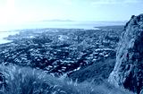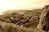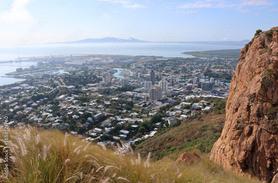 View of Townsville city with long grass in the foreground from the Castle Hill lookout in Queensland, Australia