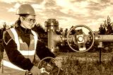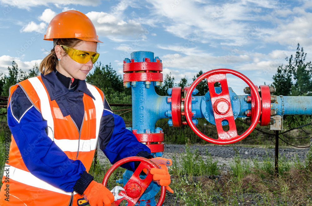 Woman worker in the oilfield repairing wellhead wearing orange helmet and work clothes. Industrial site background. Oil and gas concept.
