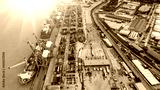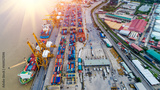 Container ship in import export and business logistic,By crane,Trade Port, Shipping cargo to harbor, Aerial view from drone, International transportation, Business logistics concept