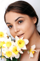 Cropped portrait of happy millennial lady holding daffodils