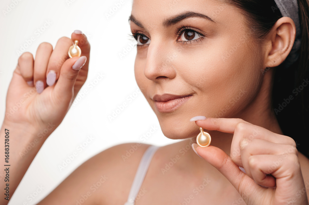 Happy smiling woman holding vitamin pils in morning