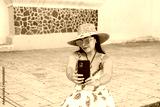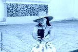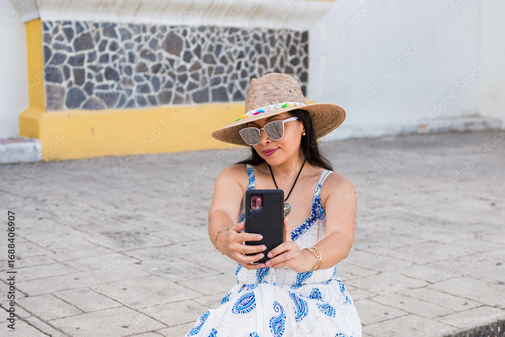 A woman in a sun hat and sunglasses sits on a stone pavement, taking a selfie with her smartphone.