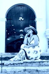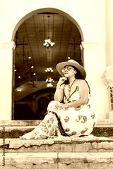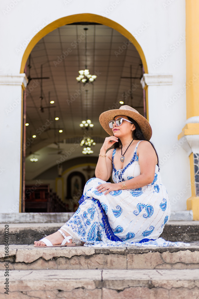 A woman in a blue and white dress sits on the steps of a church, wearing a straw hat and sunglasses.